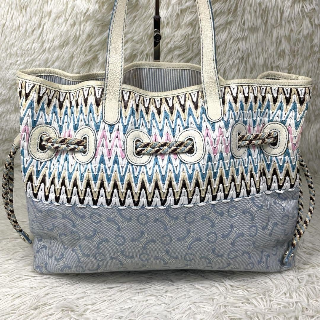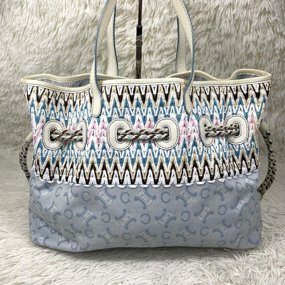 CELINE Hand Bag Tote Purse C Macadam Canvas Leather Blue Authentic