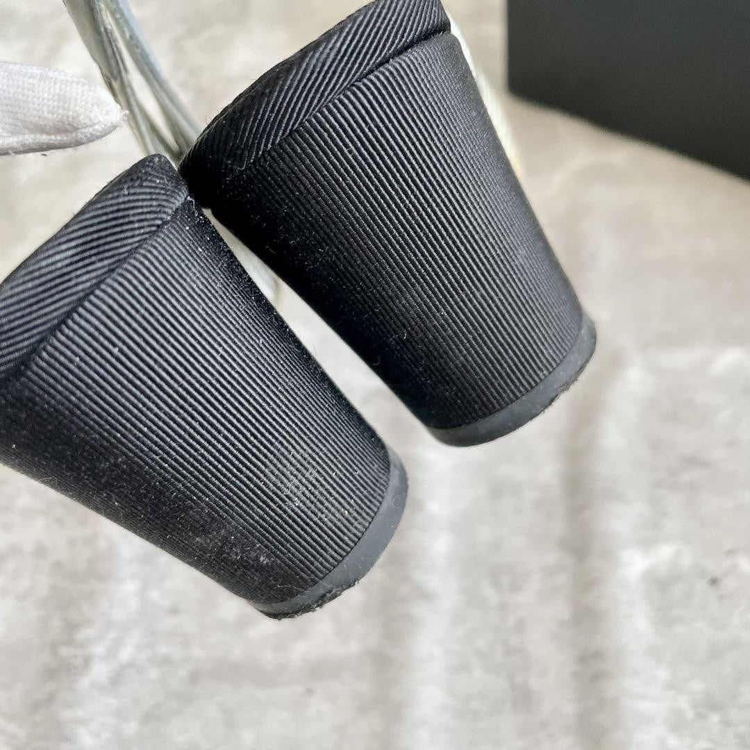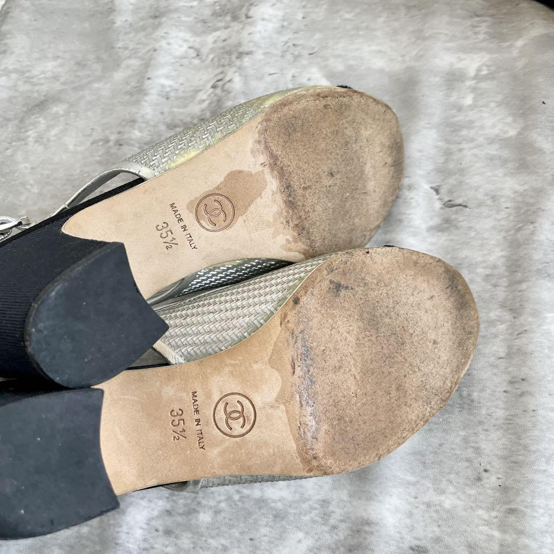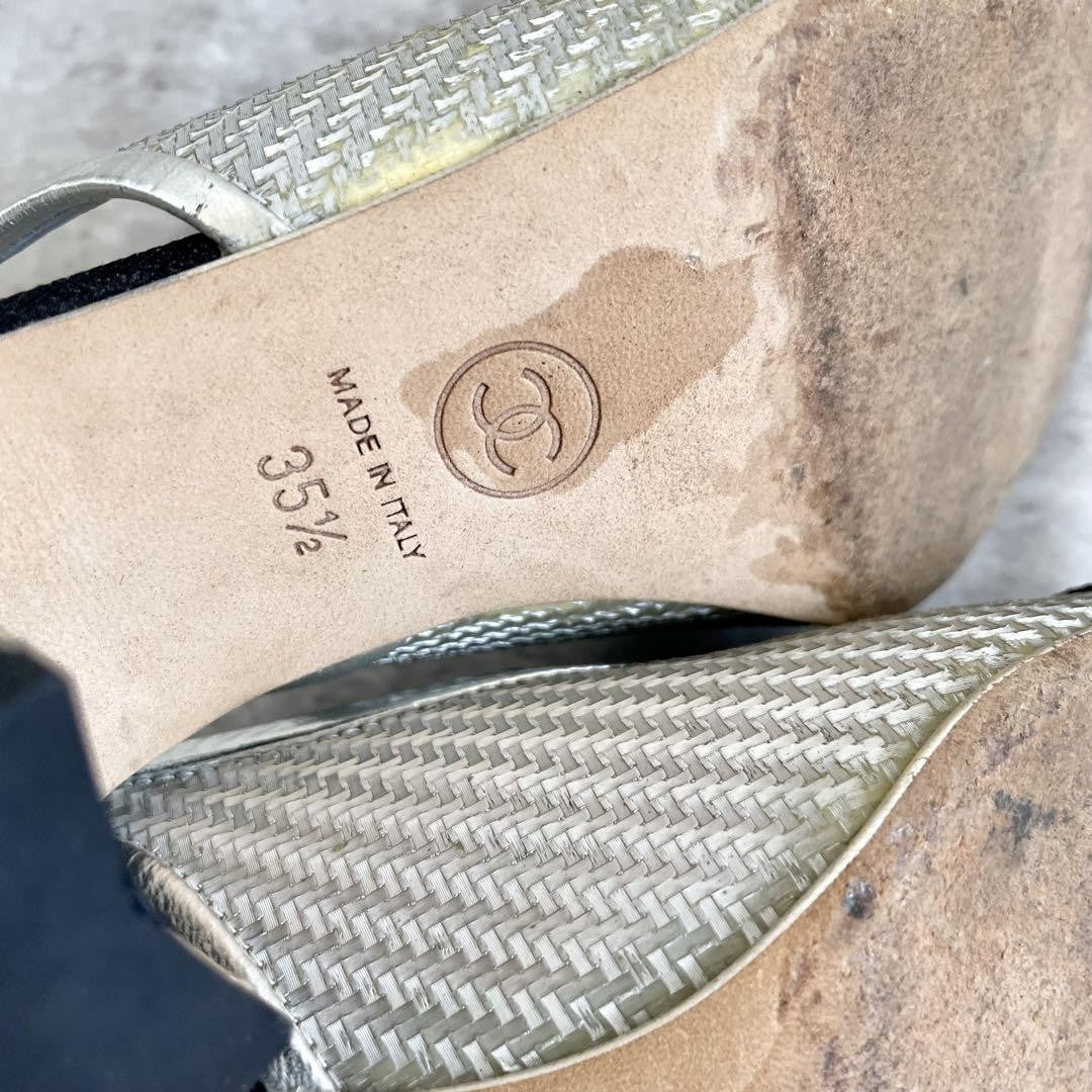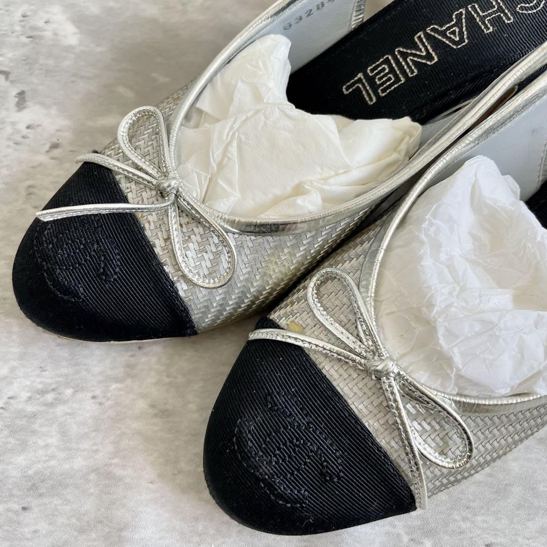 CHANEL Shoes Pumps Heel Ribbon EU 35.5 US 5.5 Silver Black Authentic