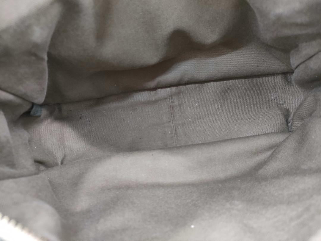 Darkening, darkening on back, dirt, scuffs on shoulder straps, wrinkled leather, frayed edges, stains on interior, scratches on metal fittings.