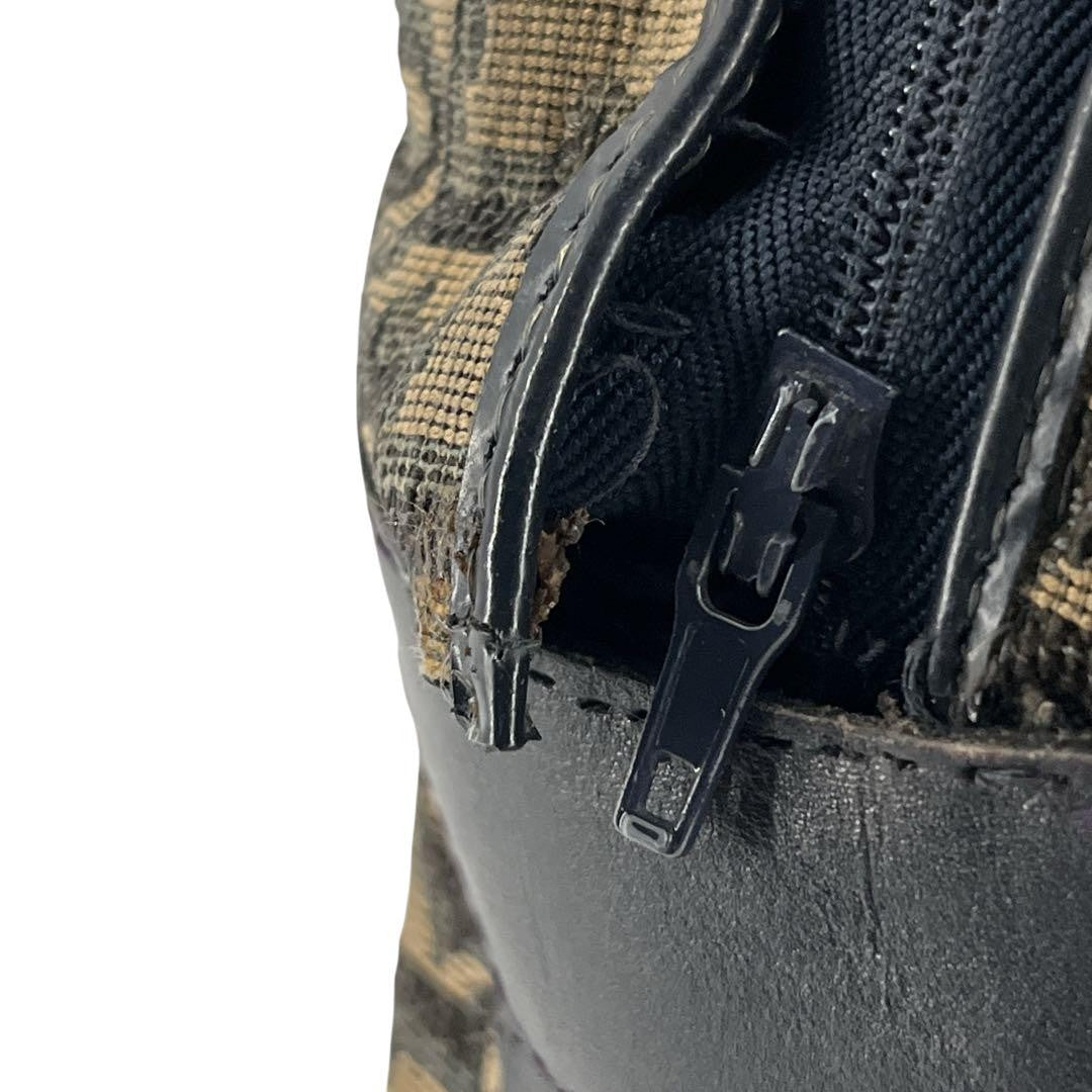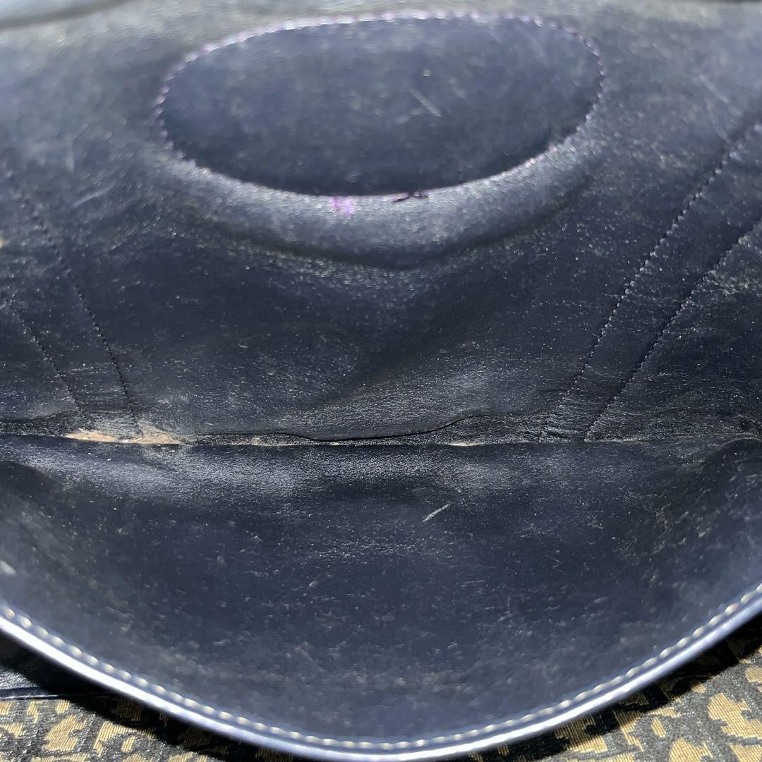 There is some overall wear, including scuffs and discoloration on the exterior, minor damage to the handle, minor scratches on the hardware, and slight staining inside (especially on the interior pocket), but the item is still in good condition and usable.