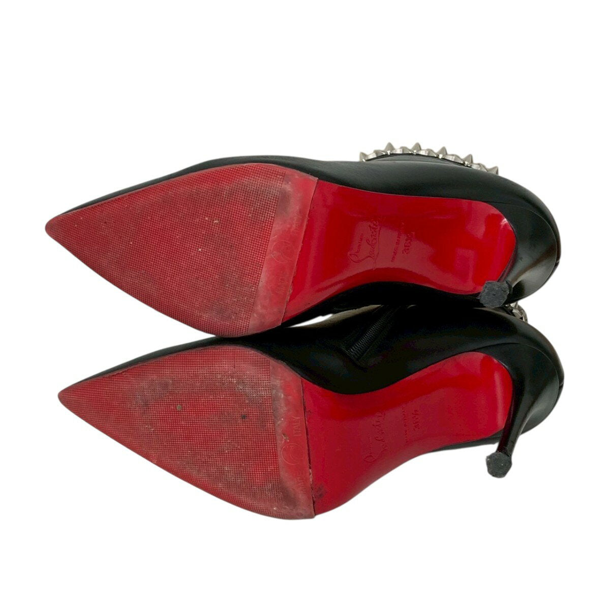 These shoes show signs of wear, including damage to the heel, dirt, and missing studs. Please note that these are pre-owned items.