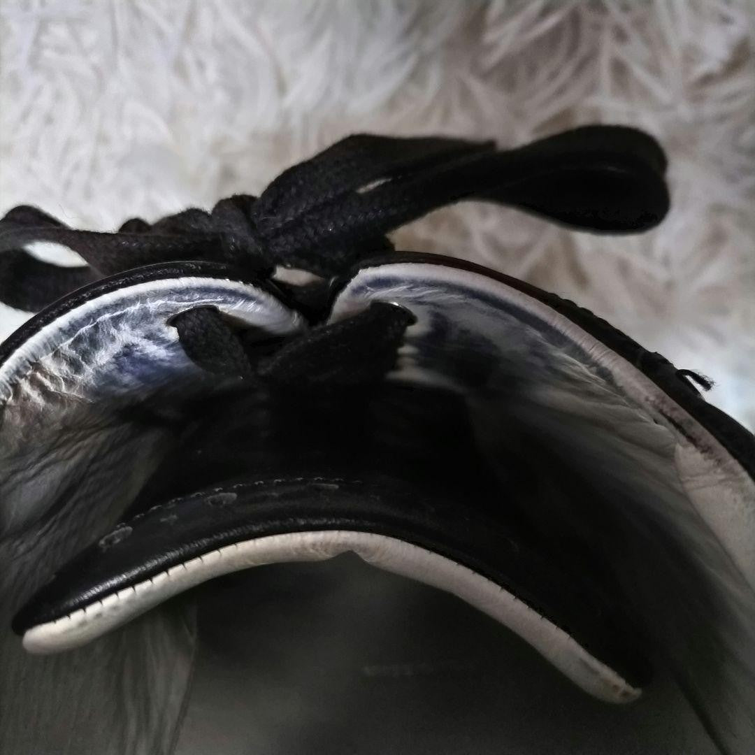 There are no noticeable stains on the exterior, but there is a tear in the heel of the insole and discoloration on the back of the shoelaces.