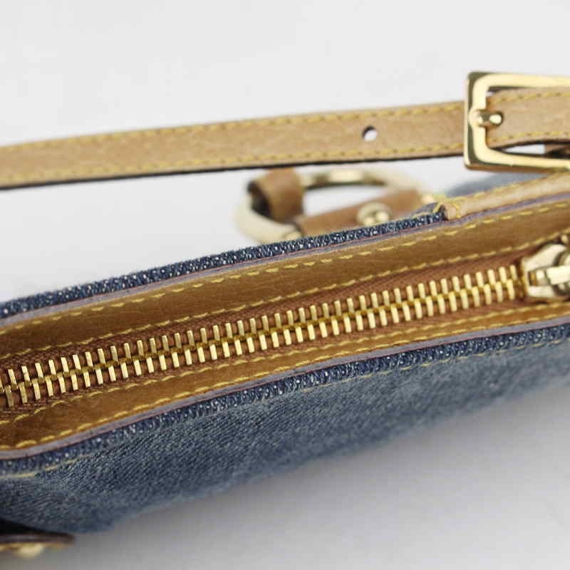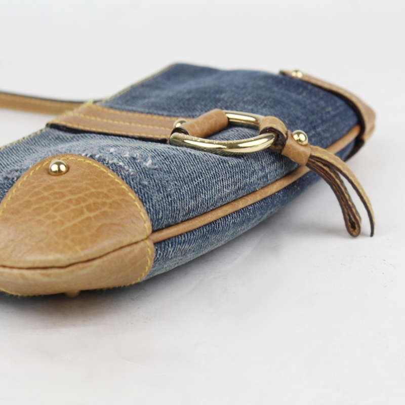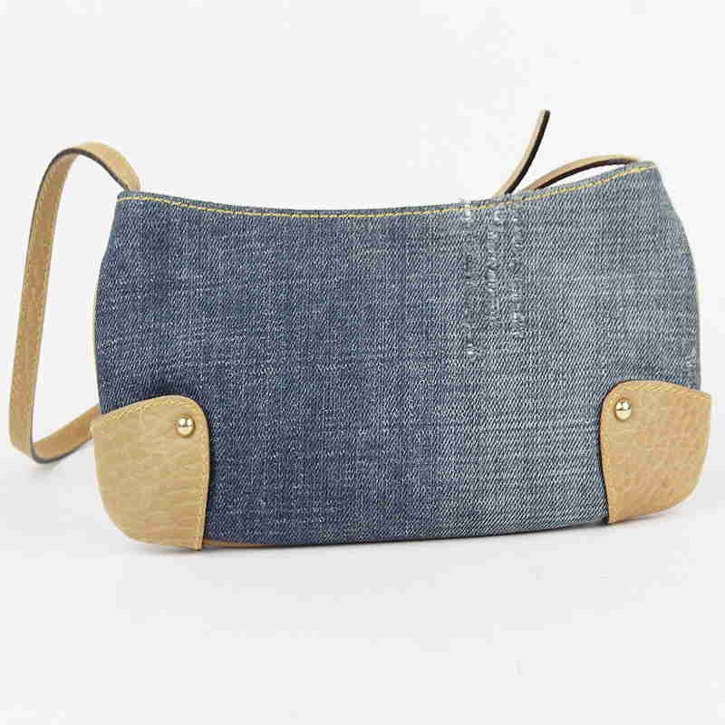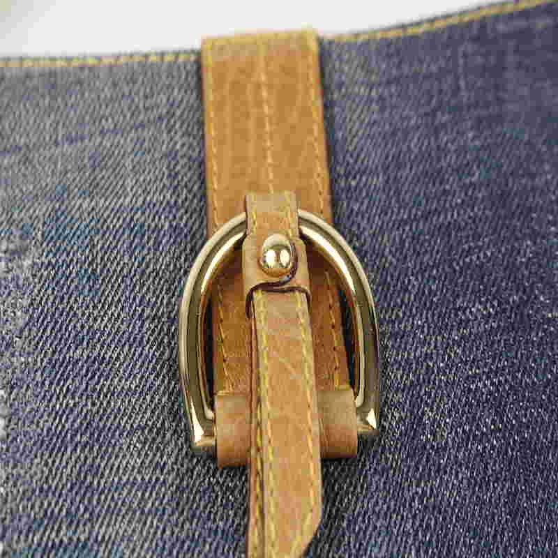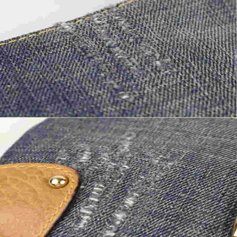 This is a used item, so it shows signs of wear and the denim part is faded and frayed.