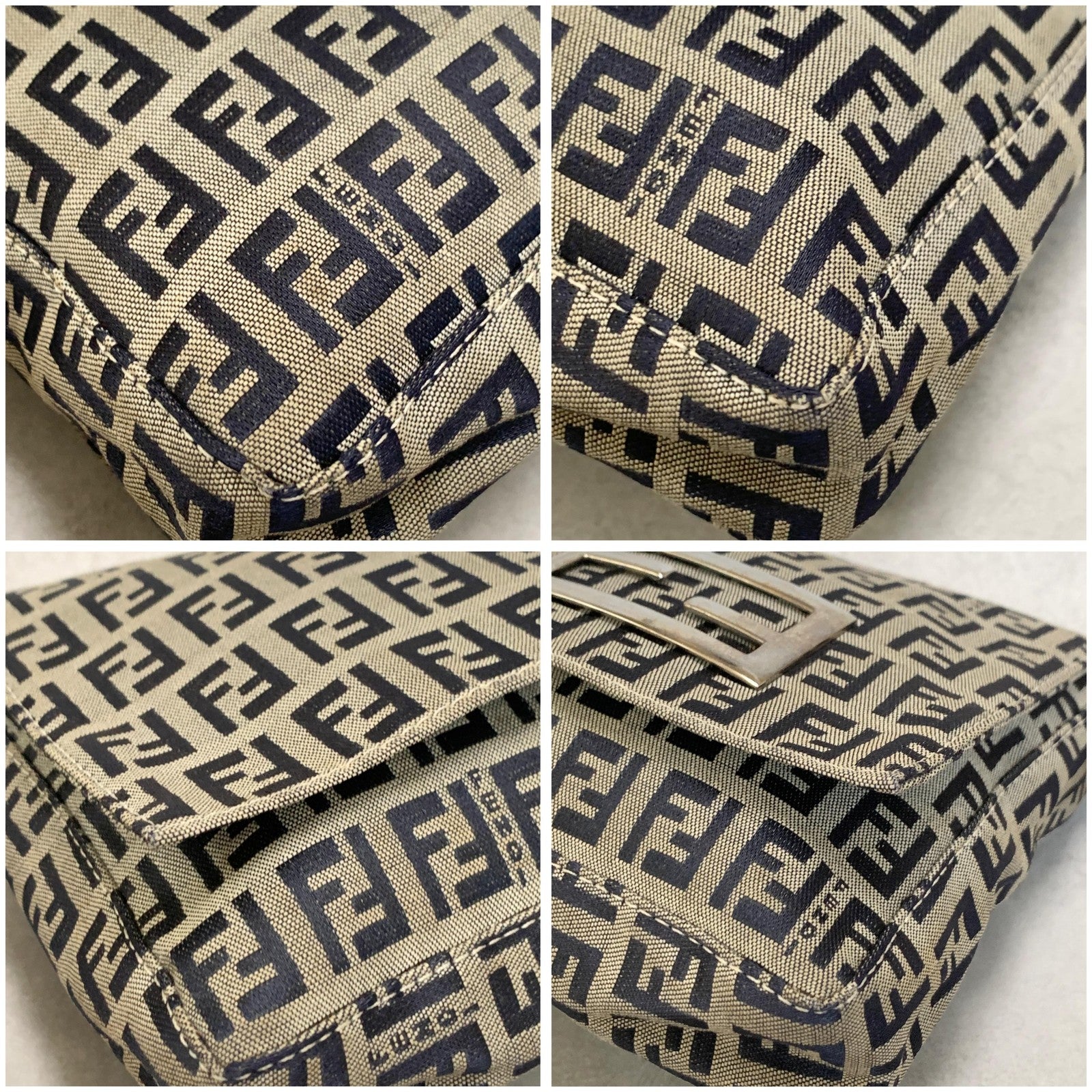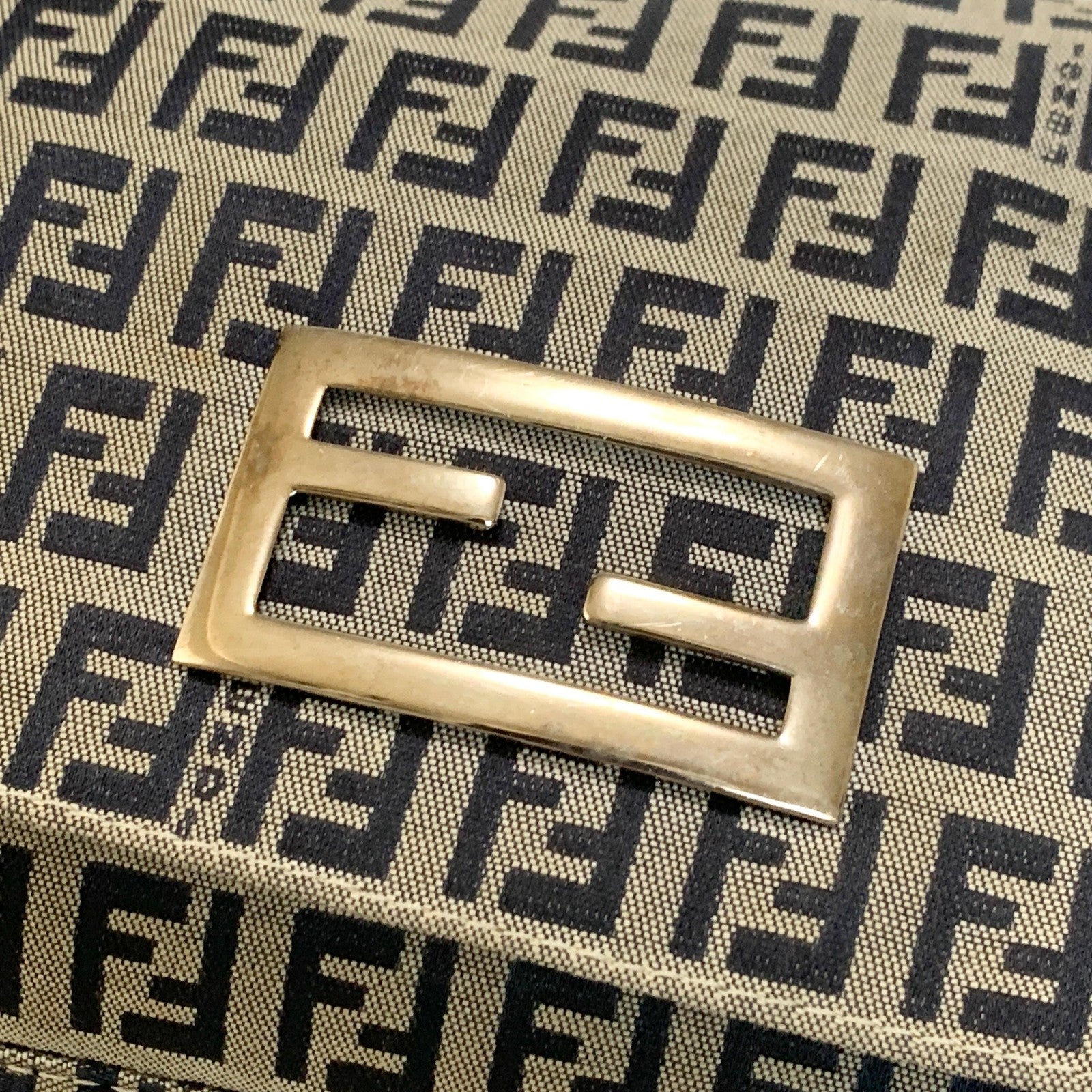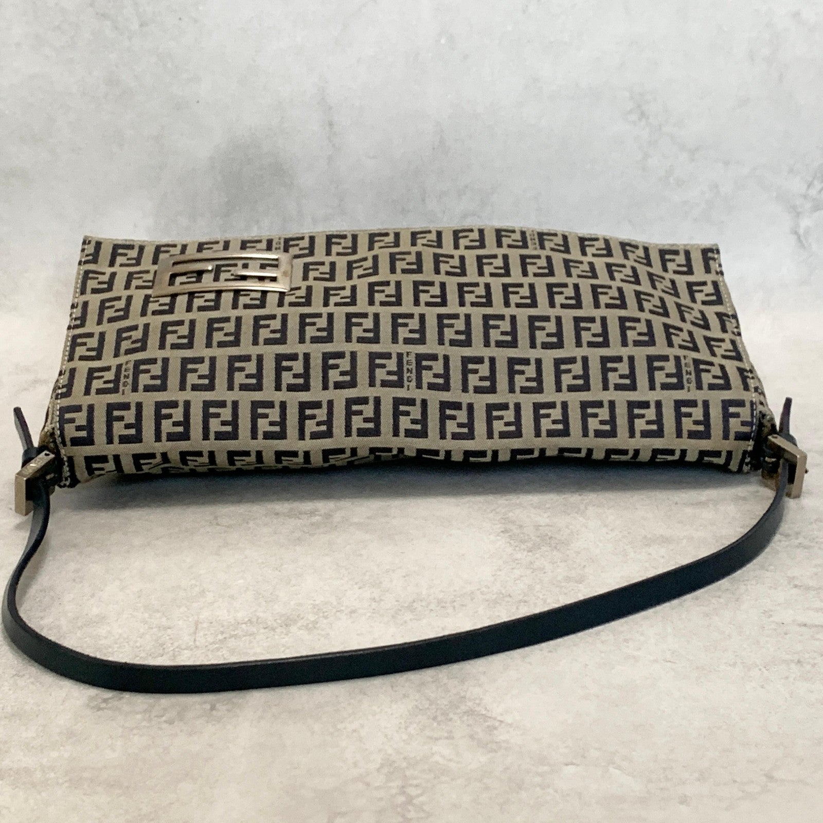 FENDI Bag Baguette FF Zucchino Shoulder Purse Canvas Leather Beige Black Auth