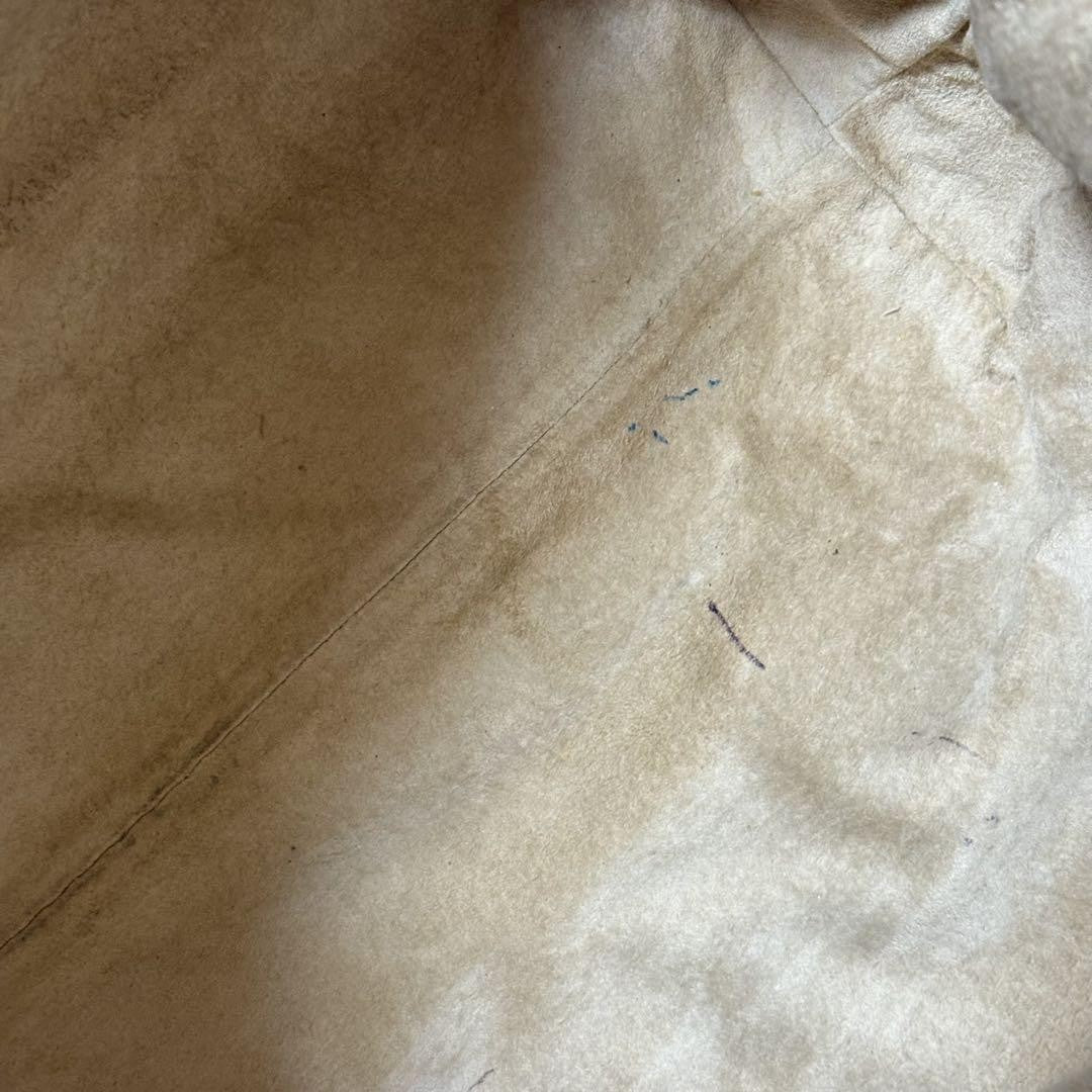 There is some scuffing on the corners of the bottom, and some ink from ballpoint pens on the interior fabric.