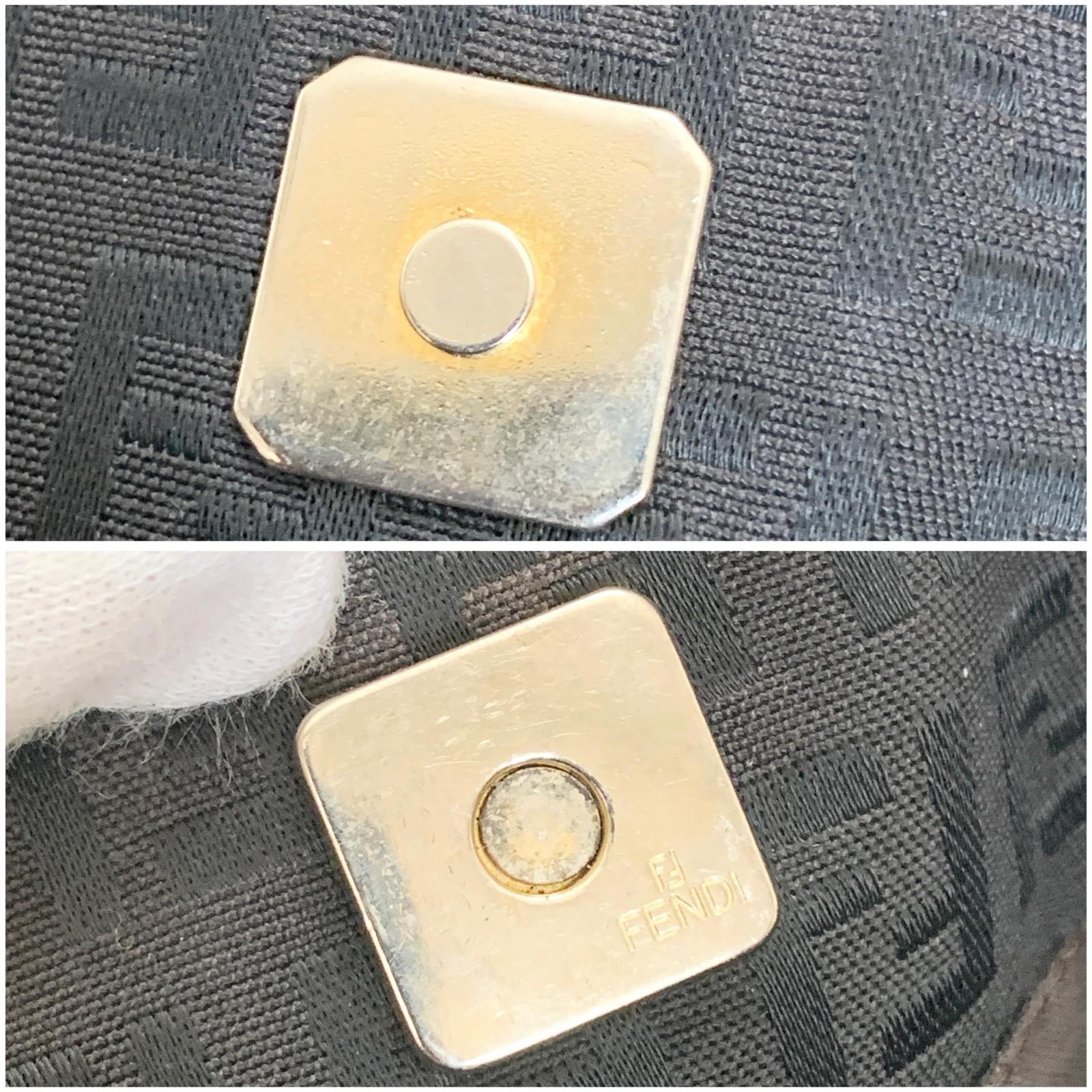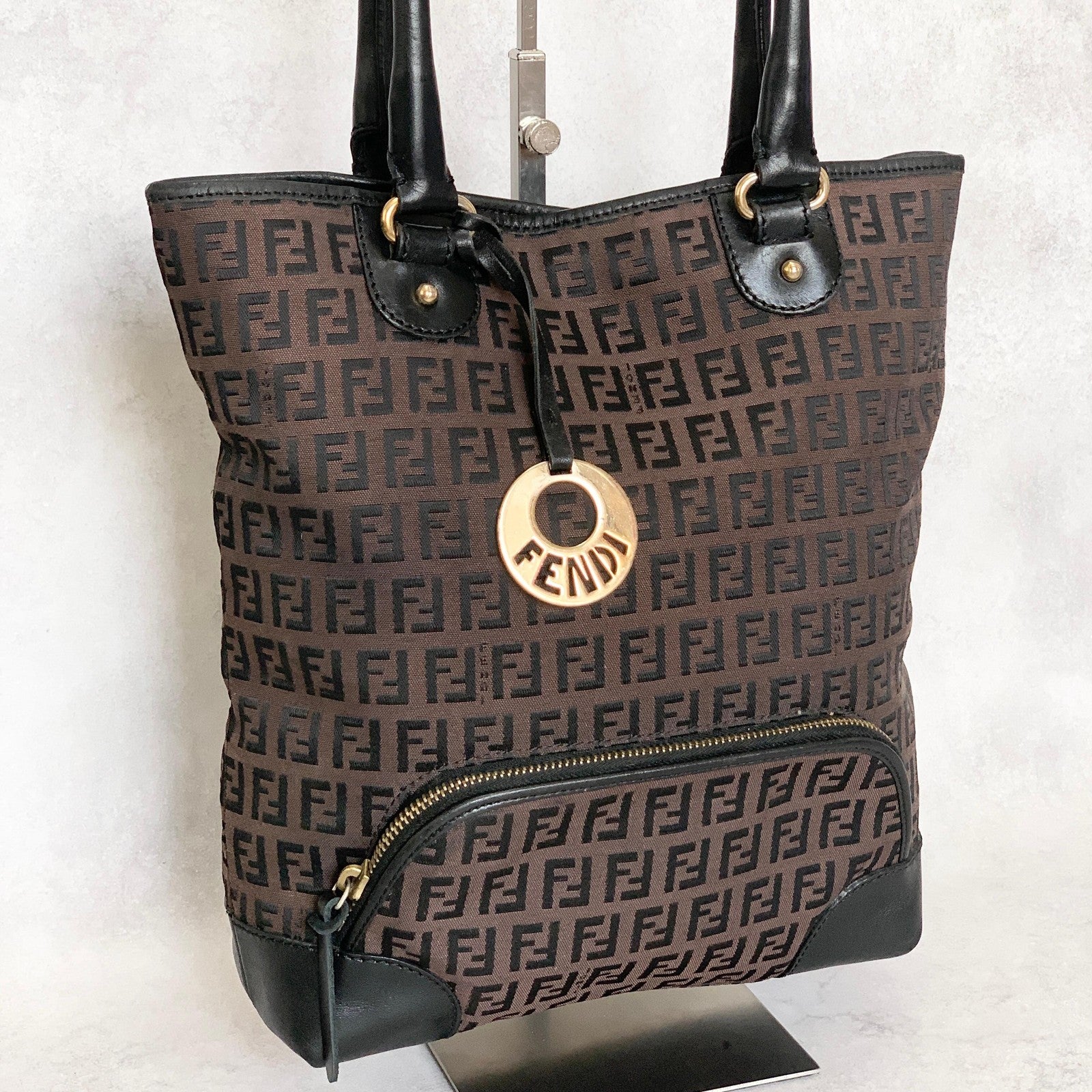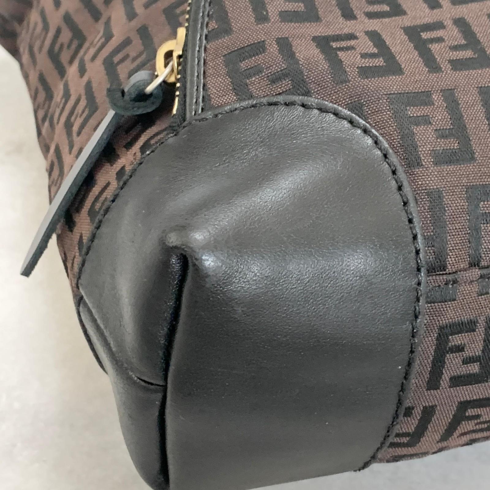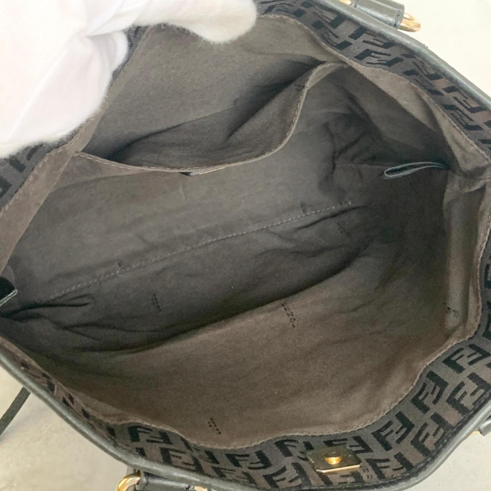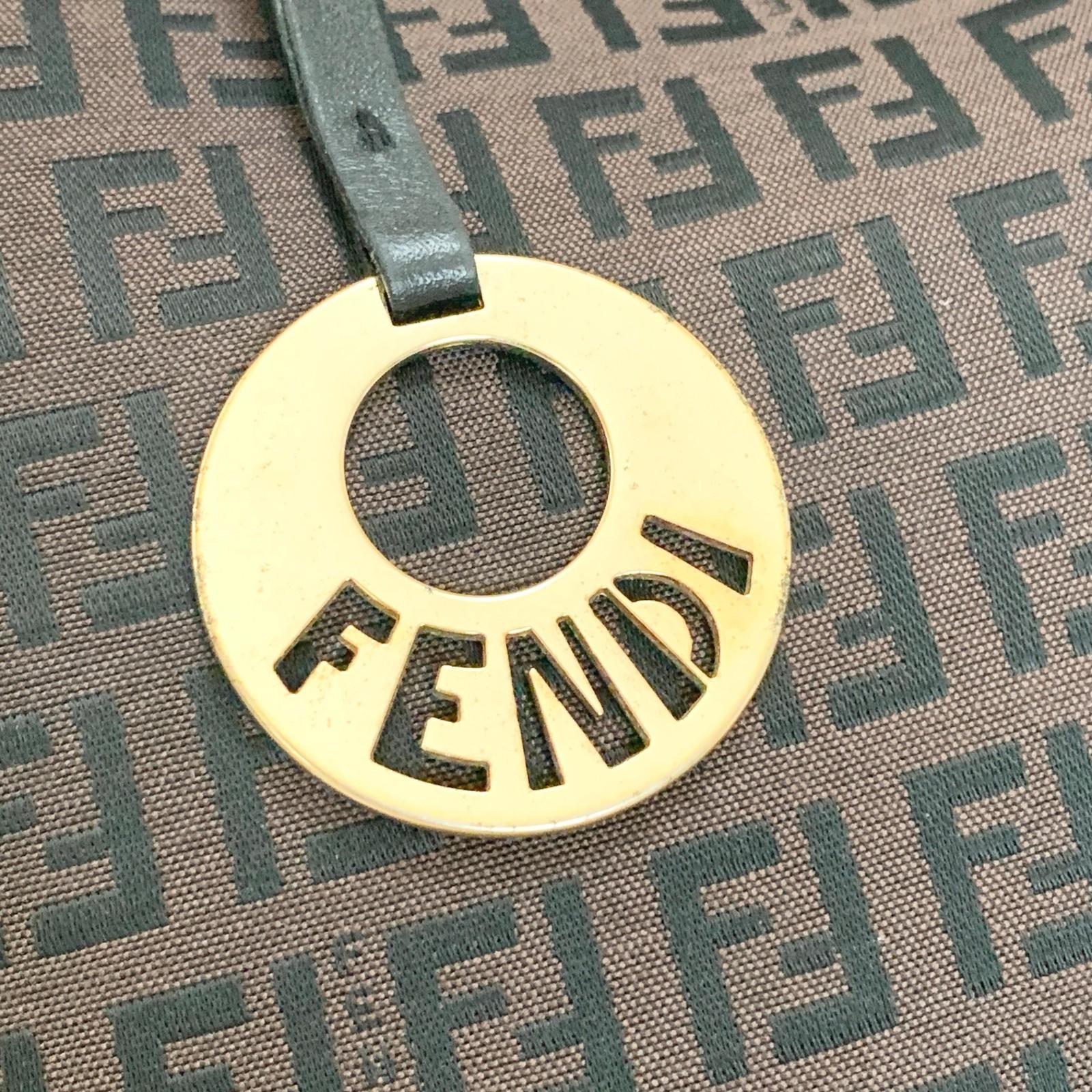 FENDI Handbag Purse Zucchino FF Logo Charm Tote Bag Canvas Leather Brown Auth
