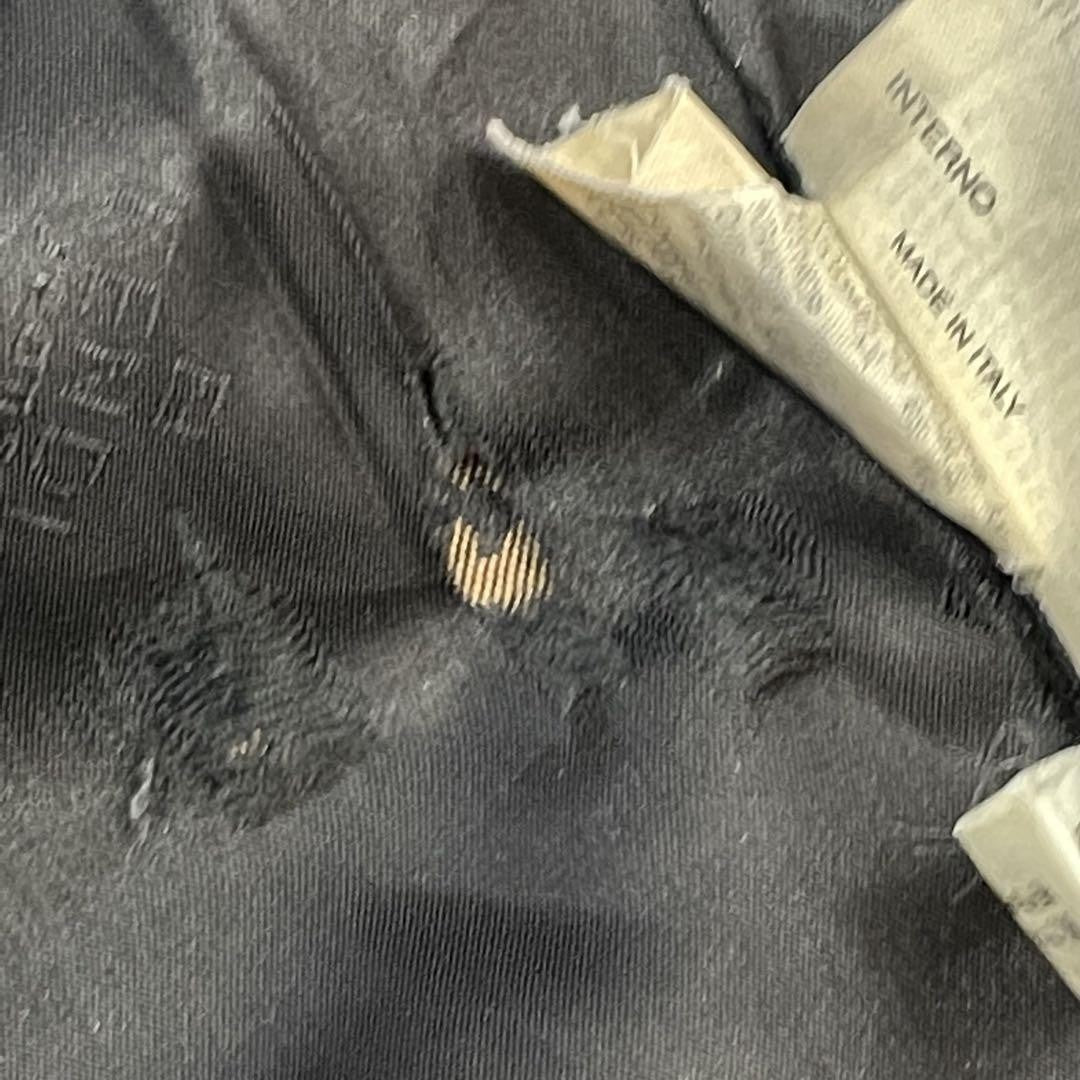 There is a slight tear near the tag on the lining material, and some fraying on the inside of the belt (see photo).