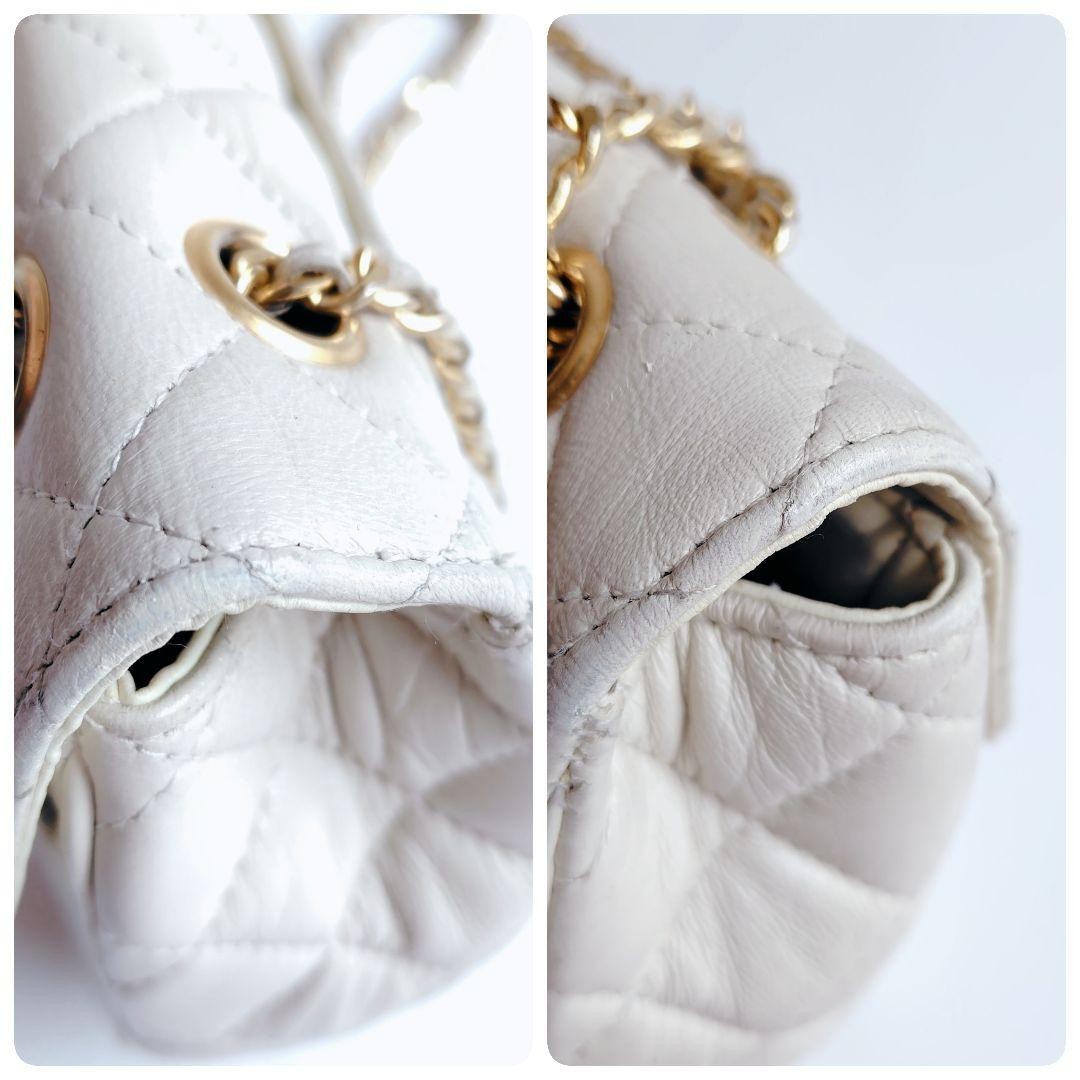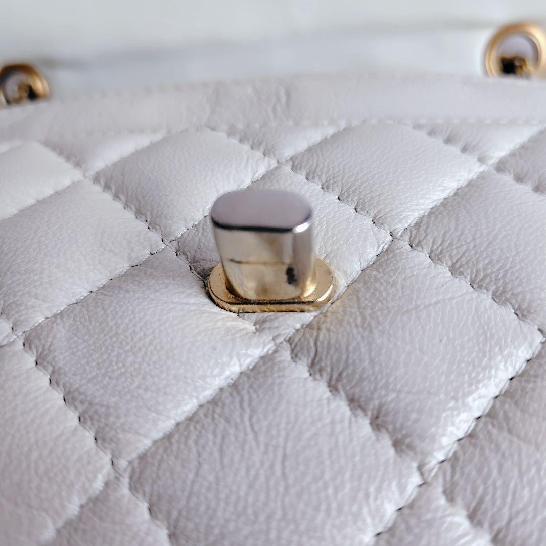 The plating on the turn lock has peeled slightly, and there is discoloration on the bottom of the inside of the bag.