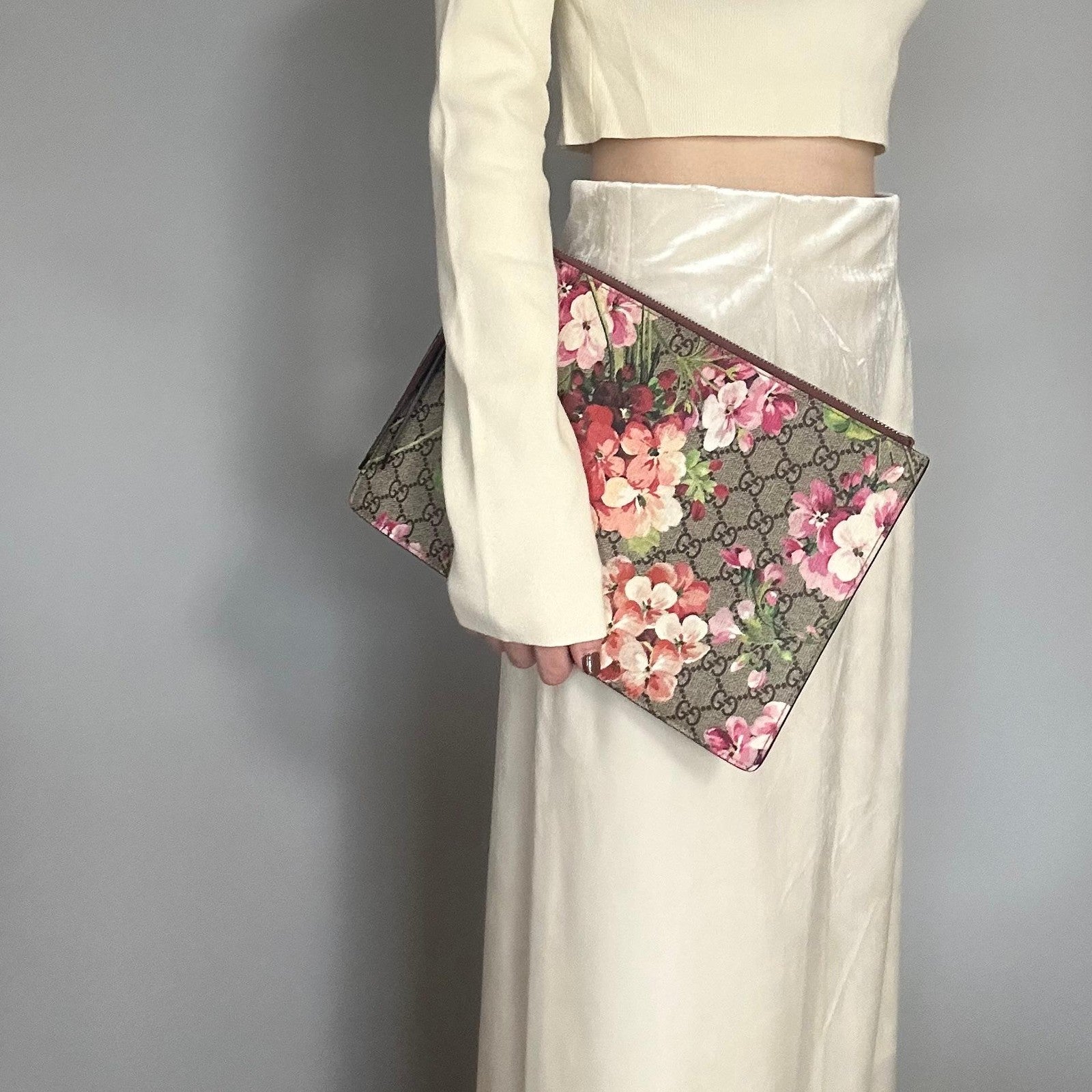 GUCCI Bag Flora GG Supreme Clutch Purse Hand Leather Beige Red Used Authentic