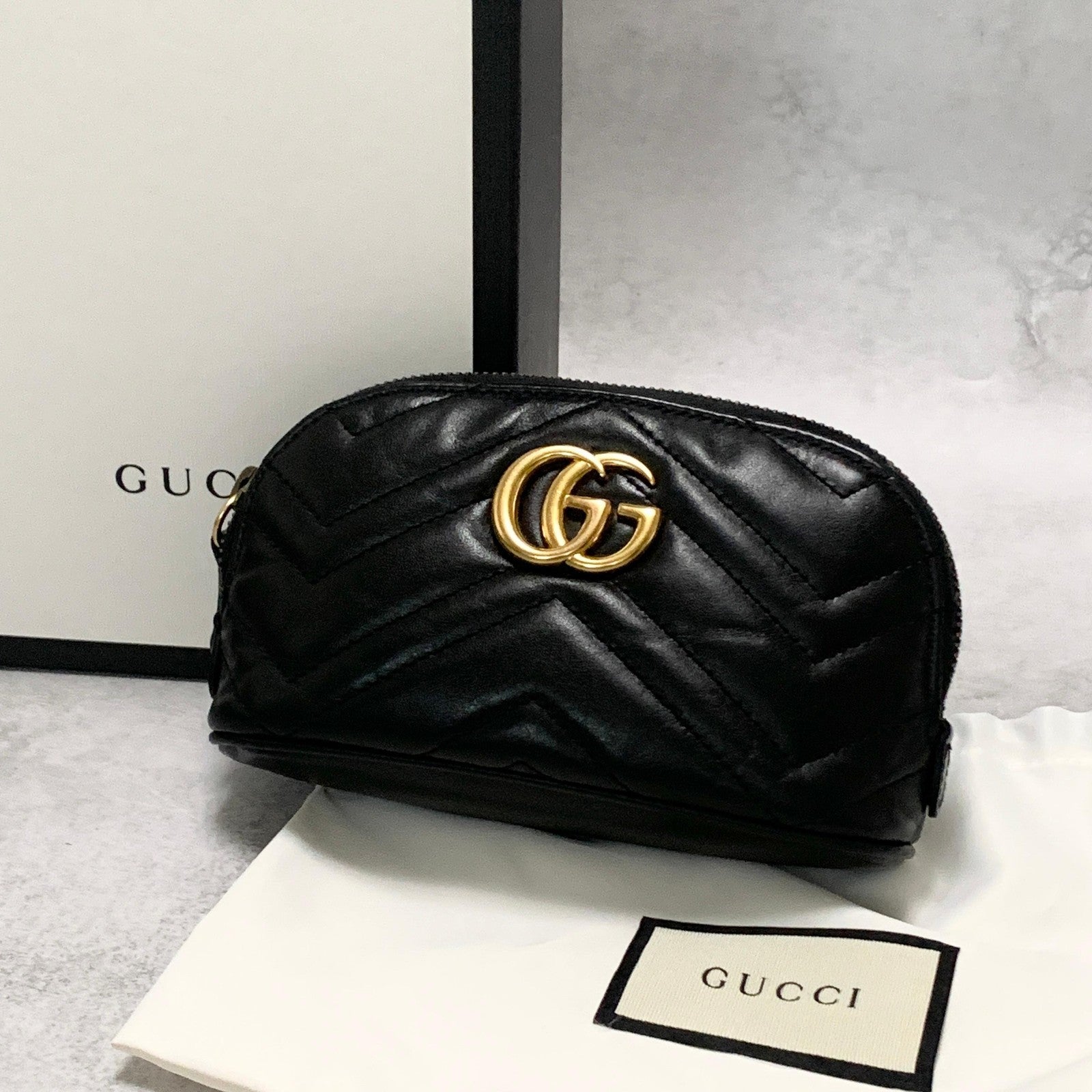 GUCCI Cosmetic Pouch GG Marmont Quilted Purse Leather Black Used Women's