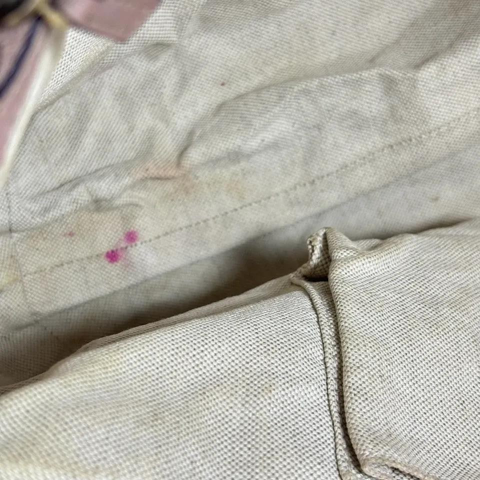 The leather has slight discoloration and deformation. There are small scratches on the metal fittings. There are a few pen marks on the interior canvas, but they are not noticeable.