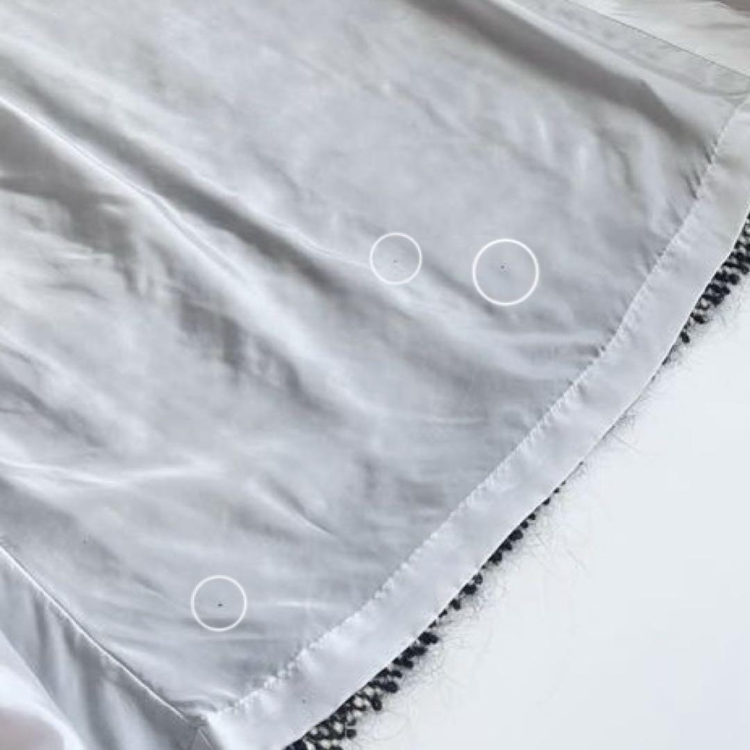 There are a few small holes in the lining, measured in millimeters, but they are barely noticeable and will not bother you when using the bag. There are no other noticeable scratches or stains, and the bag is in overall good condition.