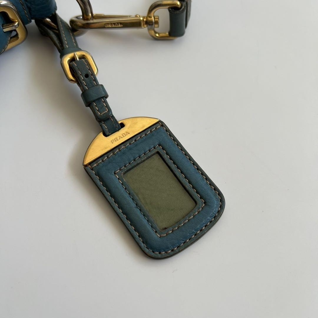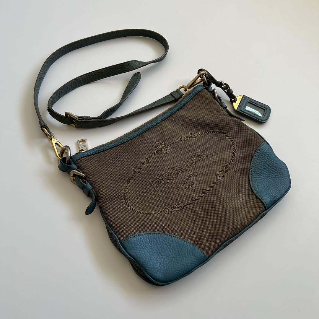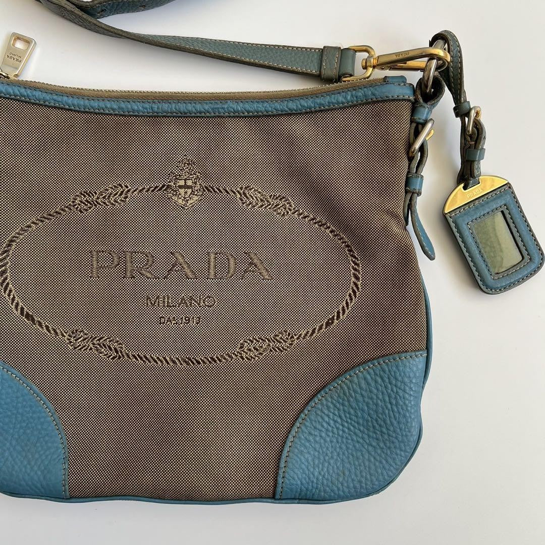 PRADA Shoulder Bag Purse Logo JACQUARD Leather Light Blue Beige Authentic