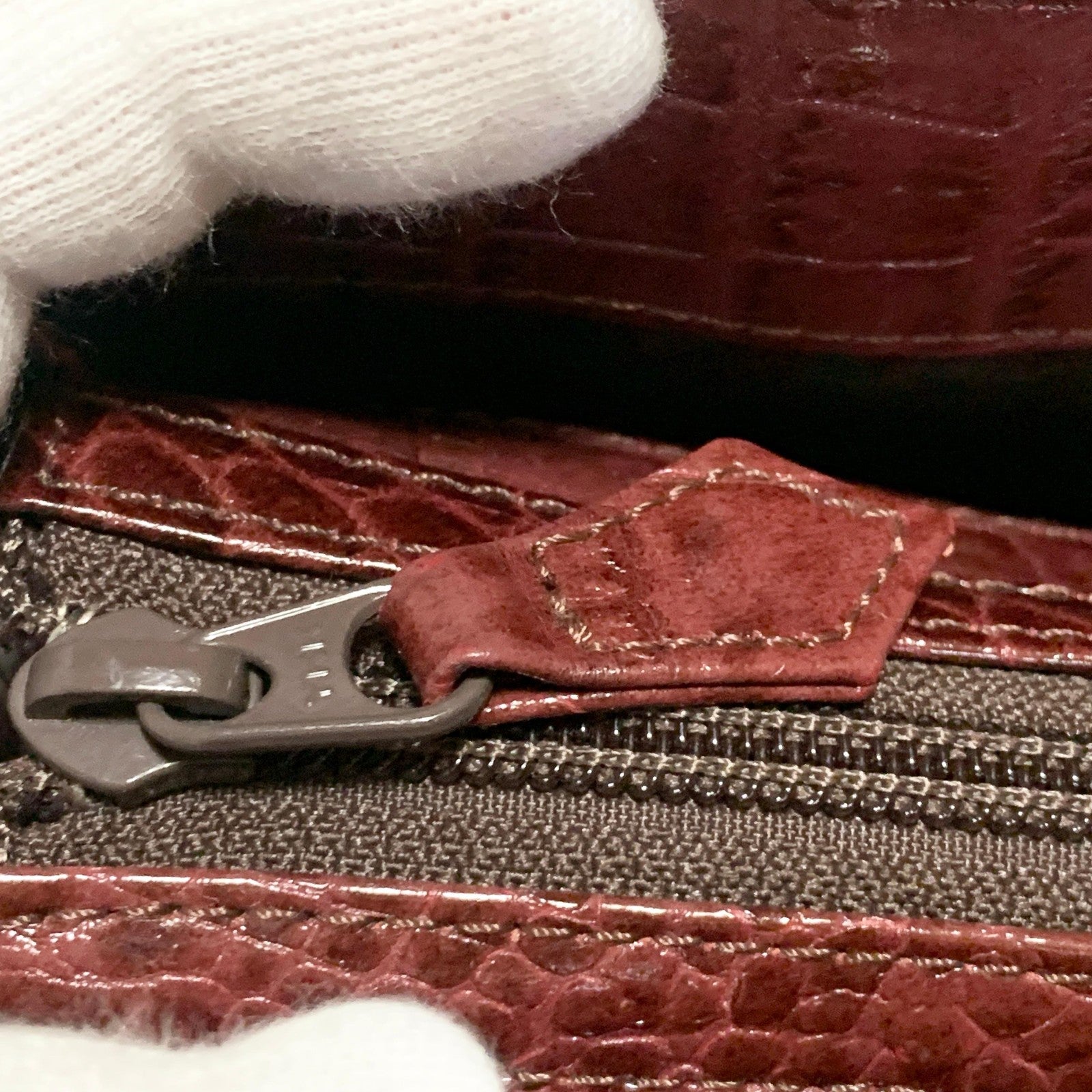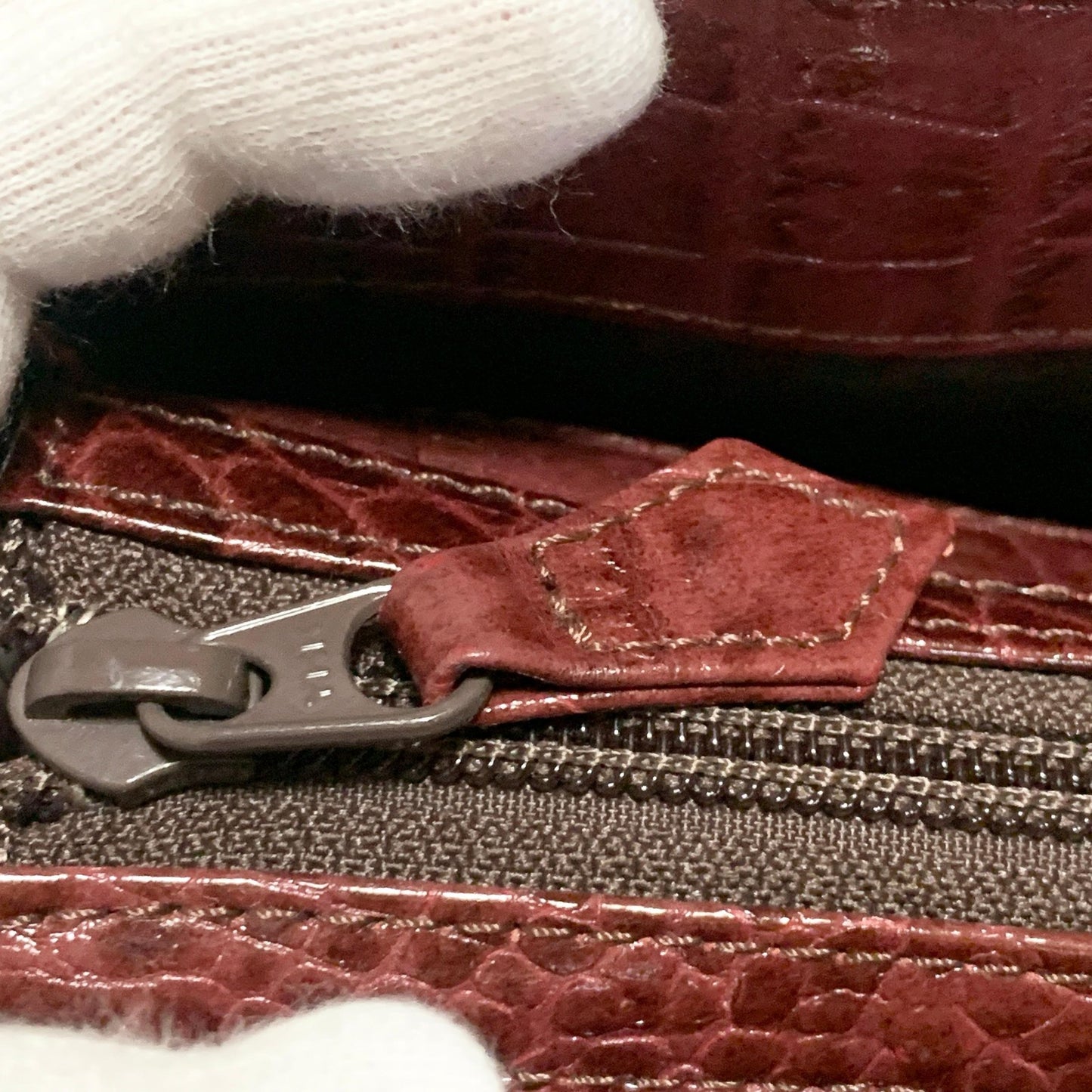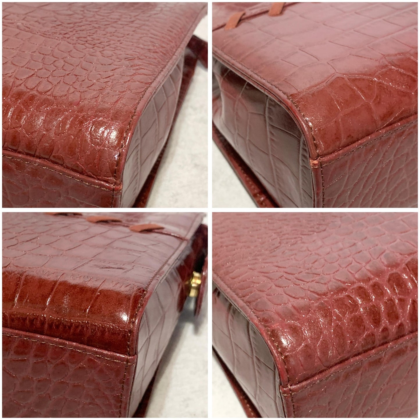 Some dirt on the front stitching, some dirt on the surface of the handle, some scuffing on the inside of the handle.