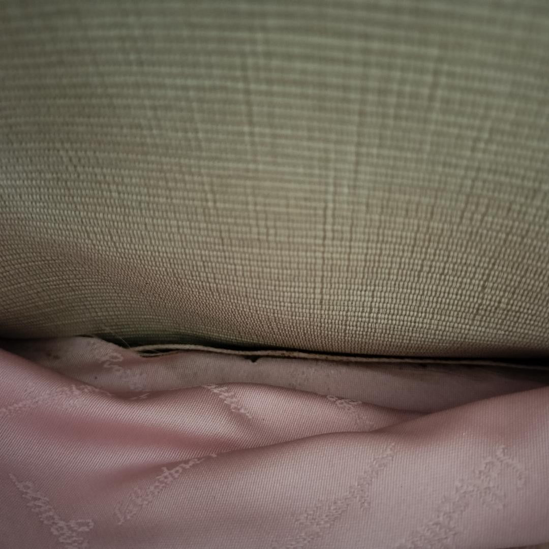 There are scuffs on the bottom corners of the exterior, and stains on the zipper line and bottom of the interior. Part of the lining inside the exterior pocket has peeled off. (See image 9)