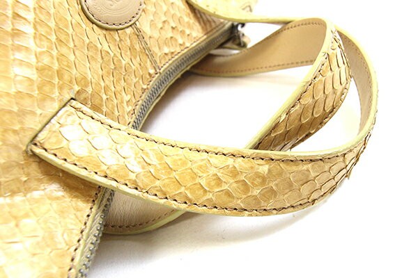 Condition: Exterior: Shape is out of shape. Python scales are peeling in places. Light scuffs around the edges and dirt on the inside of the handle.