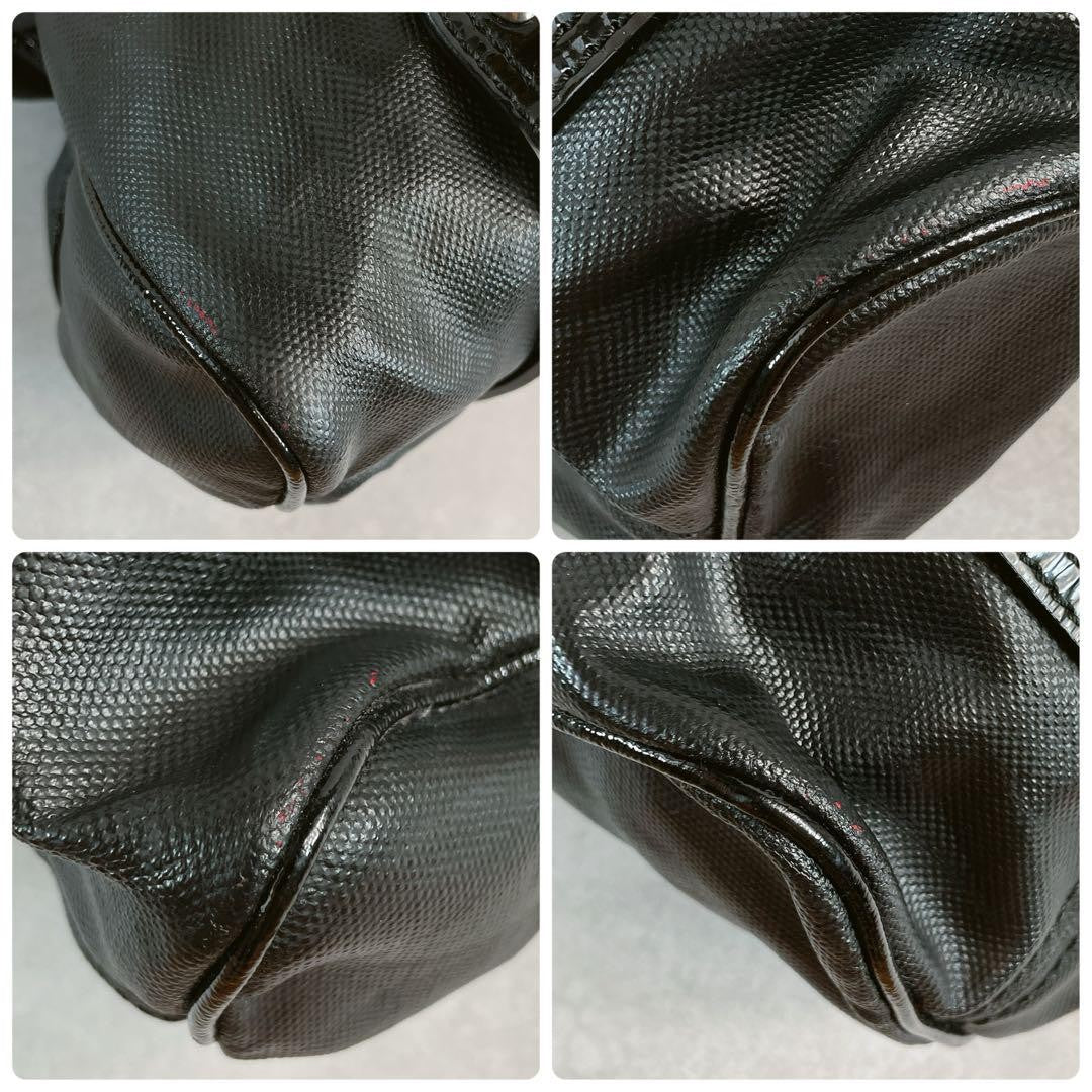The PVC leather is slightly peeling, revealing the red interior lining.