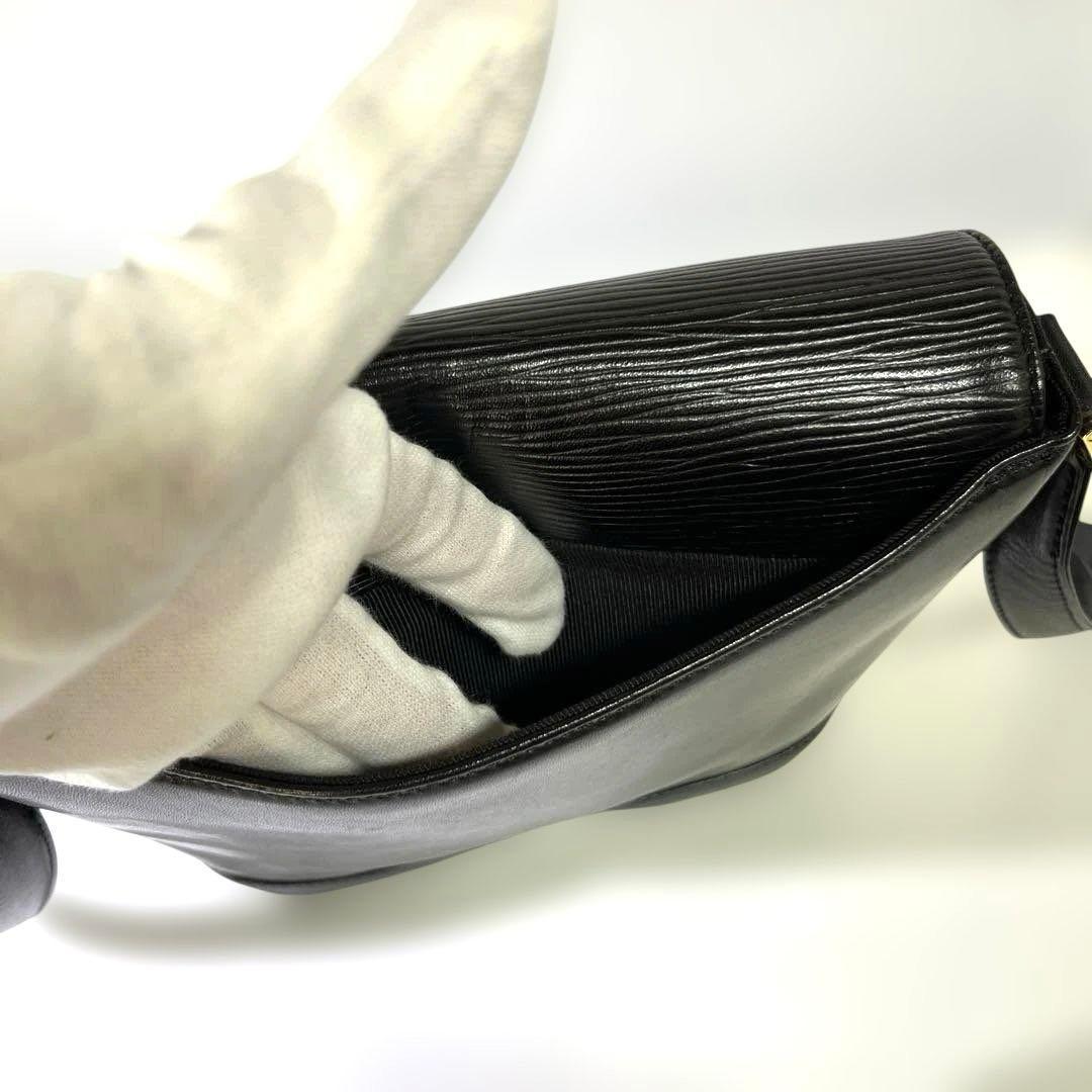 There are no noticeable large scratches or damage, but there is some slight distortion on the shoulder strap, and there are traces of where a plate with a name engraved on it was attached to the inside of the bag, which has since been removed.