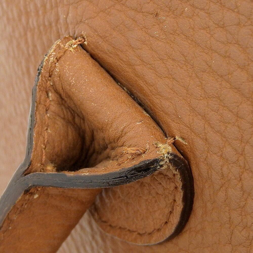 Details: Scuffs and dirt in places, loose thread at base of handle, slight bend in handle, cracks and peeling on edge, discoloration on interior logo, scratches on piping, scuffs, discoloration, and dirt on hardware.